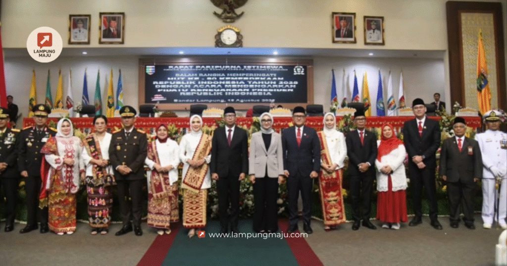 Bandar Lampung, 15 Agustus 2025 – DPRD Provinsi Lampung menggelar Rapat Paripurna Istimewa dalam rangka memperingati HUT ke-80 Kemerdekaan Republik Indonesia, Jumat (15/8) di Ruang Rapat Paripurna DPRD Provinsi Lampung.