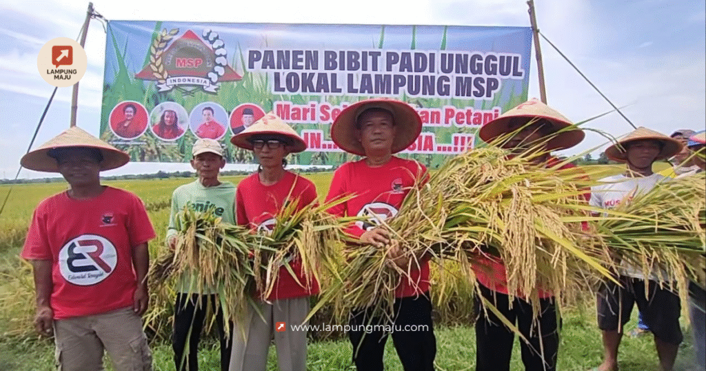 Anggota DPRD Provinsi Lampung dari Fraksi PDIP Edward Rasyid membagikan bibit padi MSP gratis kepada petani usai menghadiri panen raya di Kampung Karang, Terbanggi Besar, Minggu, 20 April 2025.