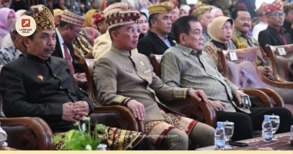 Ketua Komisi V DPRD Provinsi Lampung Bapak DR. Yanuar Irawan, SE., MM. dan Sekretaris DPRD Provinsi Lampung, Ibu Hj. Tina Malinda, S.Sos., MM. Menghadiri Acara Pemberian Gelar Adat Lampung Kepada Bapak Pj. Gubernur Lampung.
